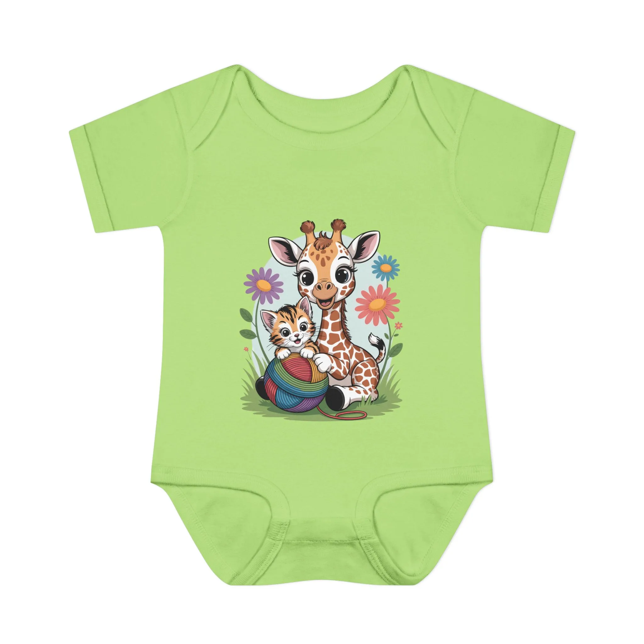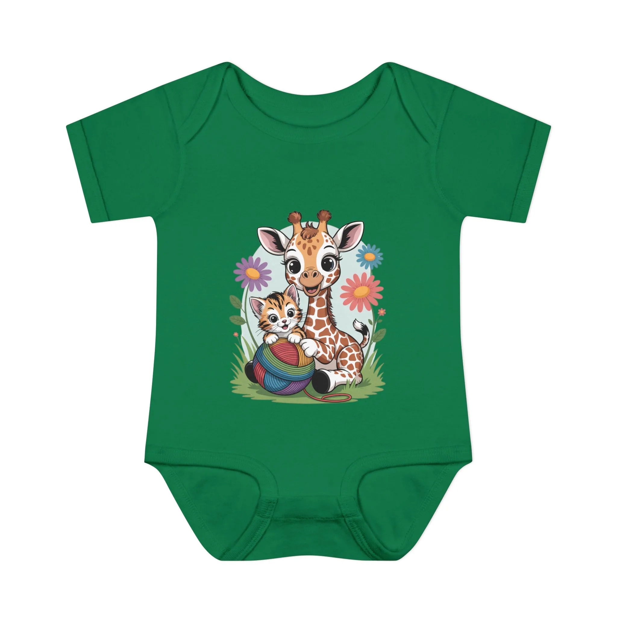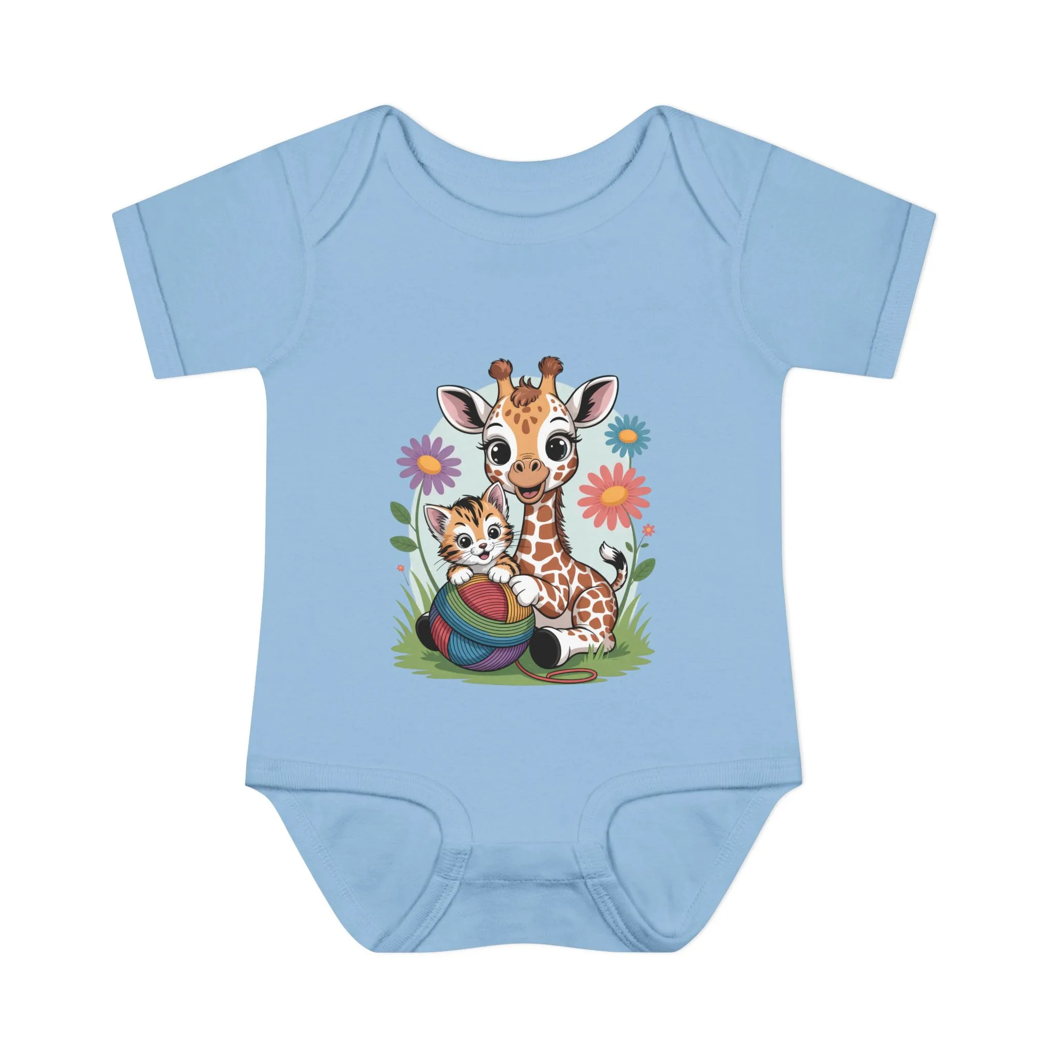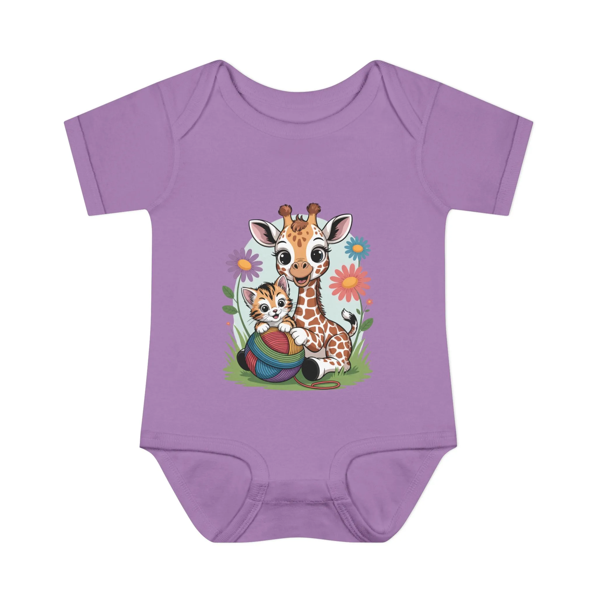Cute Giraffe and Kitten Playful Rainbow Yarn Short Sleeve Bodysuit