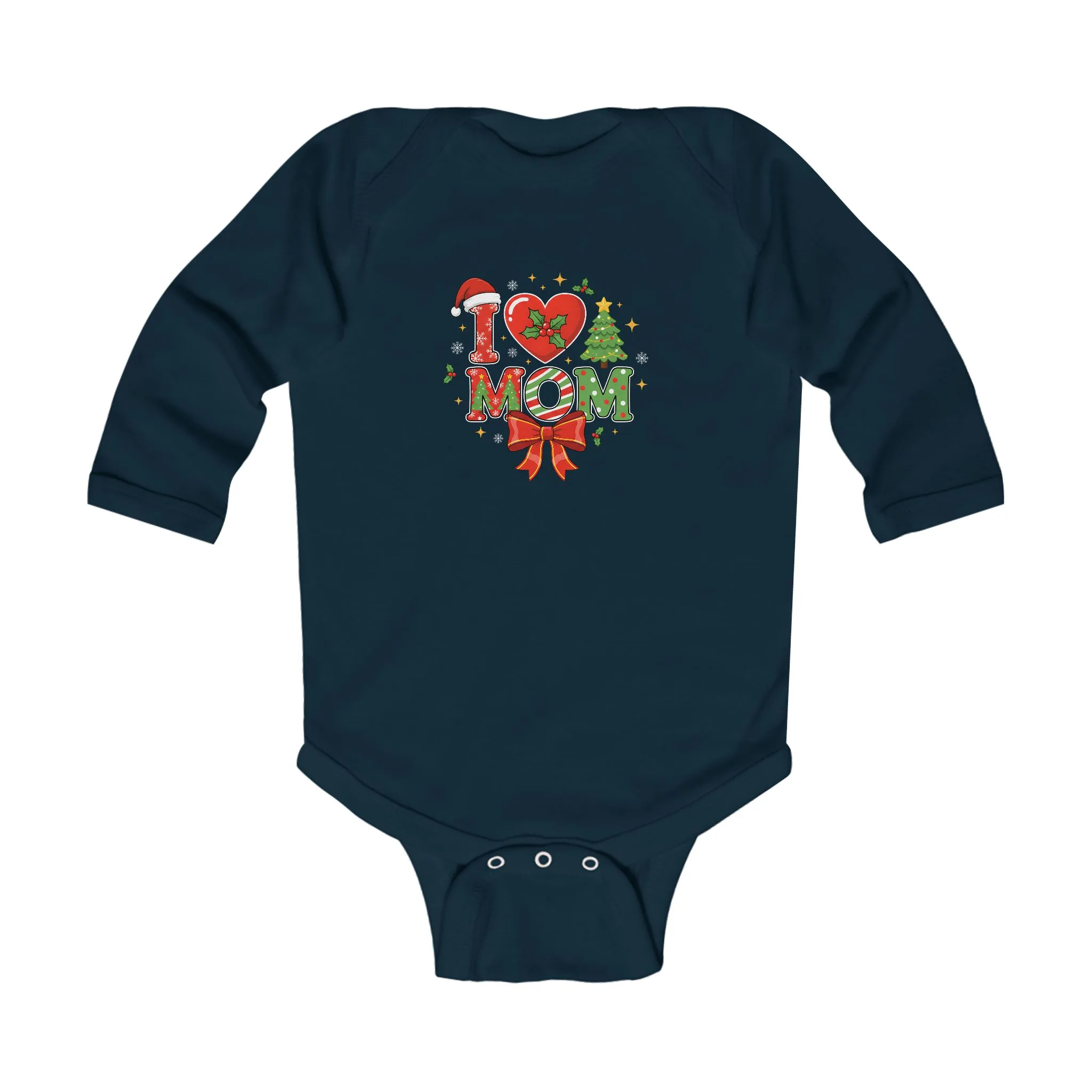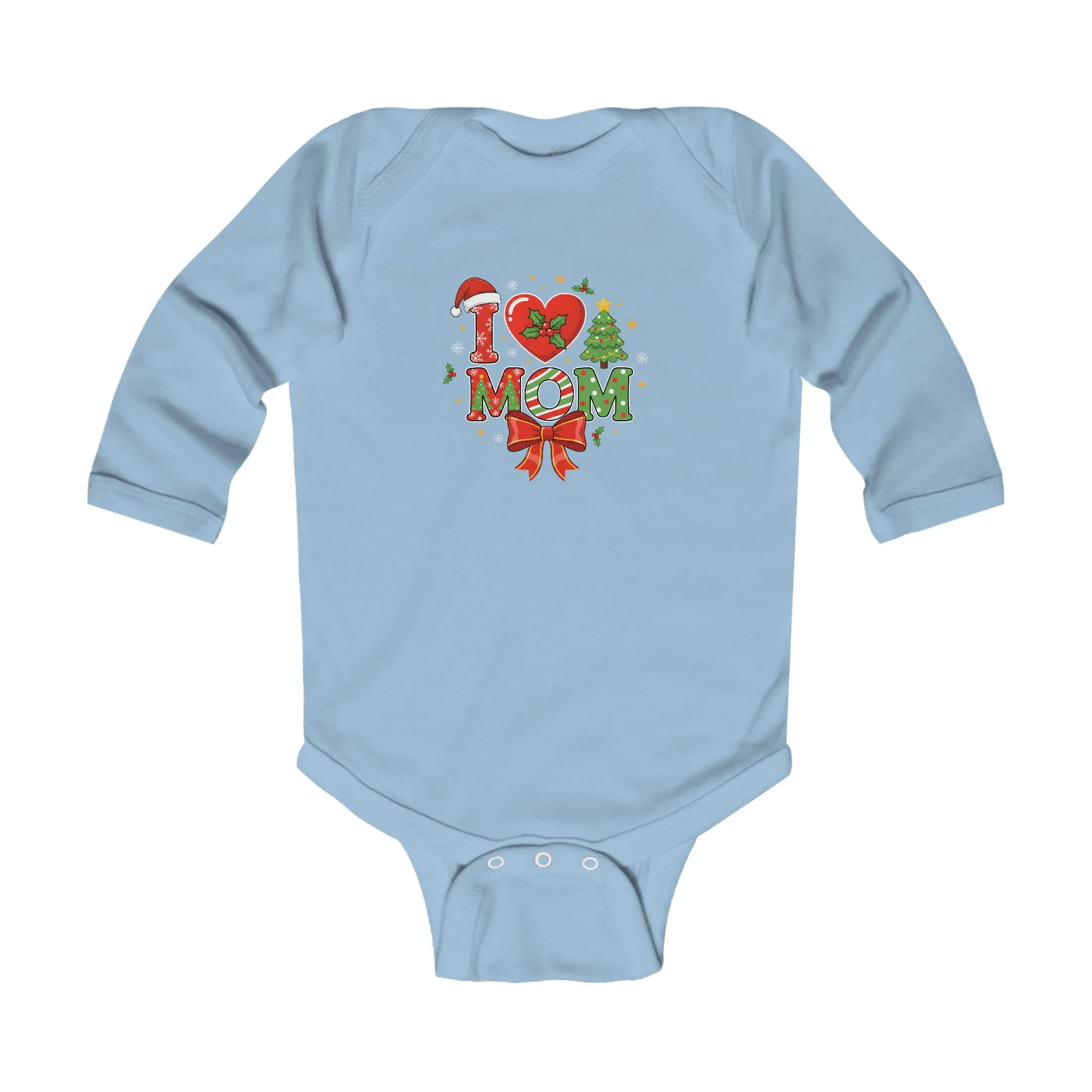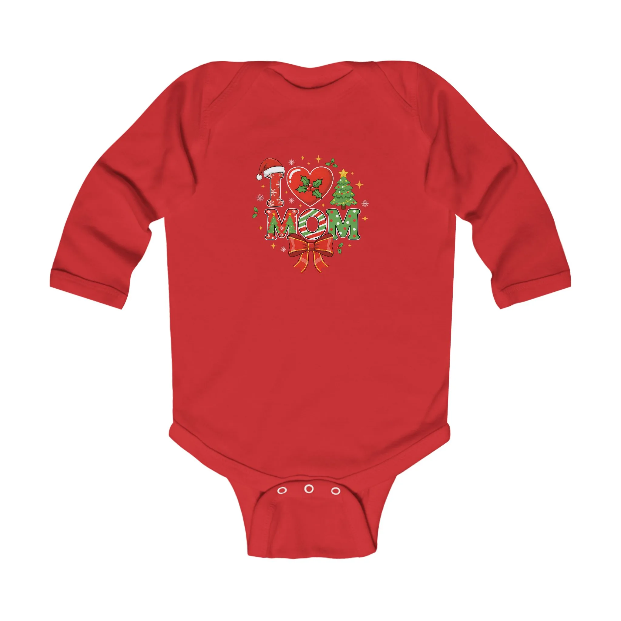 Soft, cozy, and playfully festive — this long sleeve infant bodysuit wraps tiny ones in gentle cotton while showing a cheerful holiday message to Mom. The hand-friendly ribbed binding and three-snap closure make dressing and diaper changes fuss-free. Light-weight fabric keeps baby comfortable during daytime romp or quiet cuddle sessions. The printed design mixes bright hearts, holly, and a bow for a warm, homey look that feels right at family gatherings and cozy winter mornings.