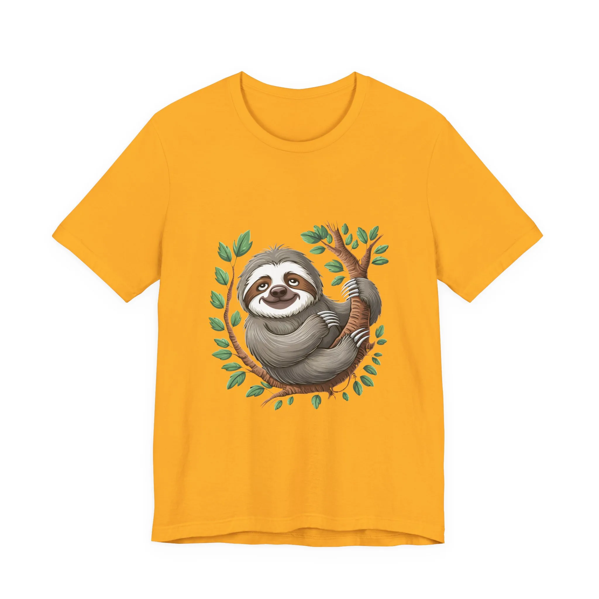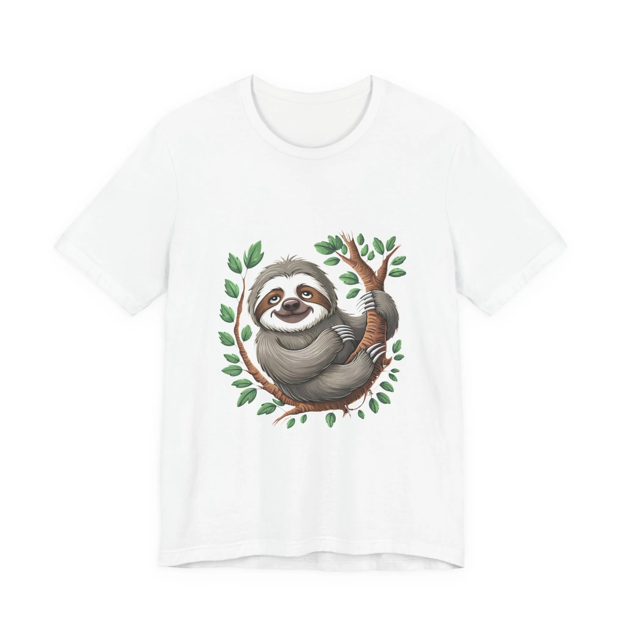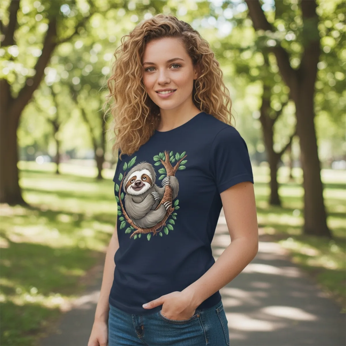 This cute sloth cartoon design features a happy sloth hugging a tree, perfect for nature lovers and cozy vibes. Ideal for printing on t-shirts, hoodies, and kids’ apparel. Soft colors, friendly expression, and a relaxing forest theme make it great for casual wear or gift items.